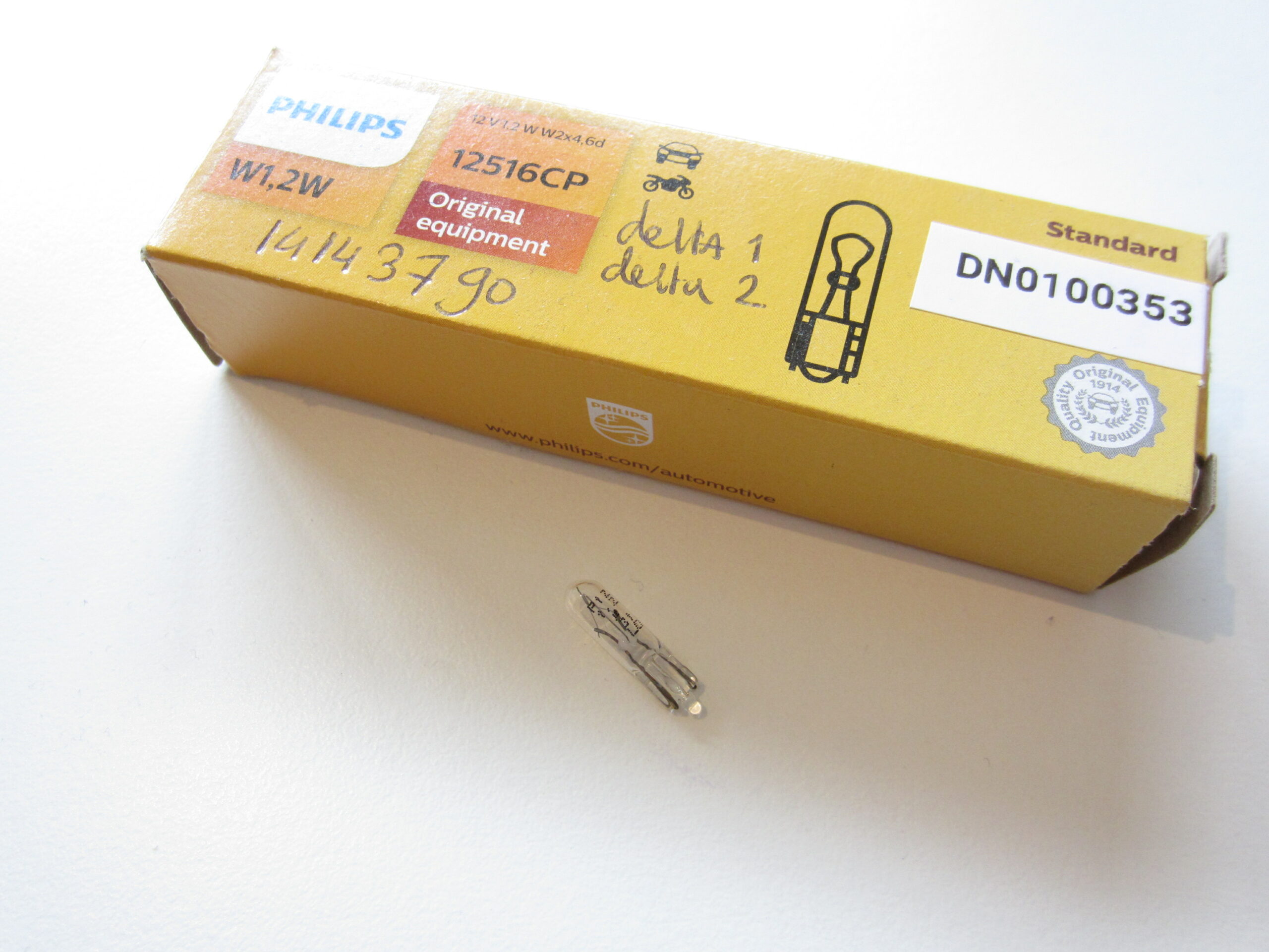 14143790 Lampadina con base in vetro Philips da 1,2Watt da applicare alla Lancia Delta Integrale per l’illuminazione della strumentazione.