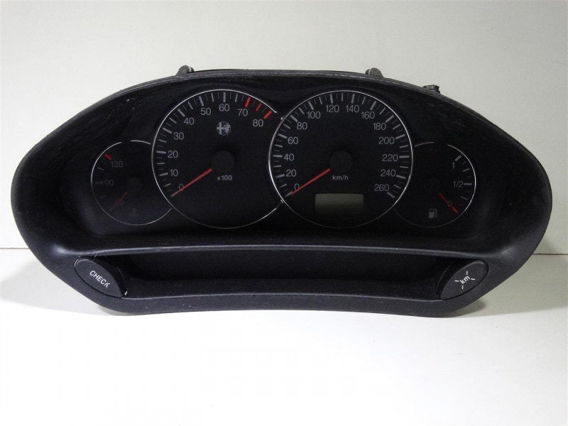 Instrumentenpaneel voor een Alfa Romeo 166 2.0 16V TwinSpark. Het instrumentarium is afkomstig uit een Alfa 166 van bouwjaar 1999. De tellerstand van de klok is ongeveer 291.000 km. Het instrumentarium omvat een toerenteller, kilomterteller, brandstofniveaumeter, en koelwatertemperatuurmeter plus controlelampjes.