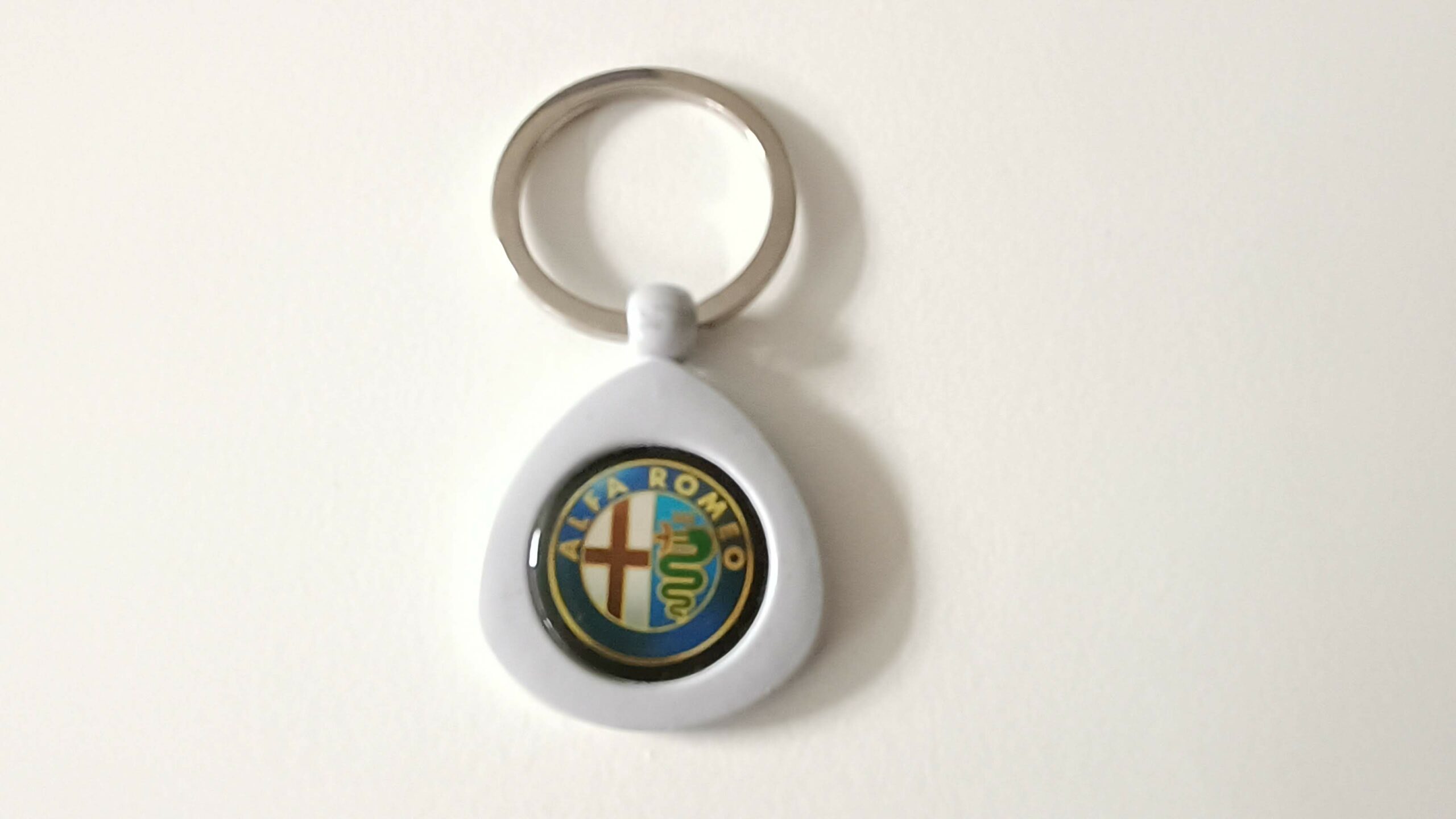 Nieuwe metalen sleutelhanger met ingelegd Alfa Romeo logo.