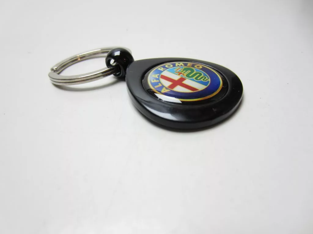 Nieuwe metalen sleutelhanger met ingelegd Alfa Romeo logo. Betreft een aftermarket sleutelhanger. Deze sleutelhanger is voorzien van het welbekende Alfa Romeo logo. De hanger is zwaar uitgevoerd in zwart metaal. Het logo is een full colour print achter een dik transparant kunststof. Logo zit achter hard kunststof dus geen zachte silicone.